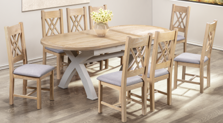 Pieces have washed Oak tops with bases and legs finished in Putty Grey highlighting on the natural oak grain